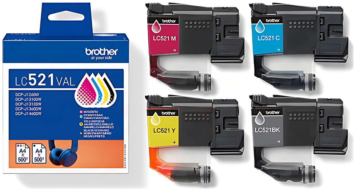 Brother LC-521VAL Tintenpatrone MultiPack Bk,C,M,Y, 4x500 Seiten ISO/IEC 19752 VE=4 - Hohe Kapazität für gestochen scharfe Ausdrucke.