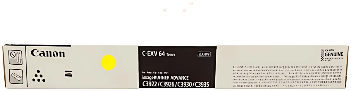 Die Herstellernummer Canon C-EXV64 / 5756C002 bezeichnet ein Verbrauchsmaterial des Typs Toner, das in bestimmte Drucker passt, darunter z. B. "Canon imageRUNNER Advance DX C 3900 Series", "Canon imageRUNNER Advance DX C 3922 i" und "Canon imageRUNNER Advance DX C 3926 i". Die Komponente hat die Farbe gelb und eine erwartbare Reichweite von 25’500 Seiten.