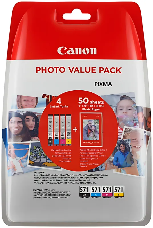 Die Canon CLI-571 / 0386C008 Tintenpatrone MultiPack ist eine Premium-Tintenpatronenlösung, die speziell für Canon Pixma Drucker entwickelt wurde. Dieses 4-teilige Farbset (schwarz, cyan, magenta, gelb) mit je 7ml Volumen und zusätzlichem Fotopapier 10x15cm (50 Blatt) bietet eine kostengünstige Komplettlösung für Heim- und Bürodrucker.