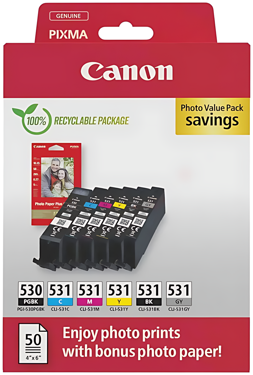 Das Canon PGI-530/CLI531 / 6117C004 Tintenpatrone MultiPack ist ein hochwertiges 6-teiliges Tintenpatronen-Set, das speziell für Canon Pixma TS-Drucker entwickelt wurde. Dieses MultiPack enthält eine pigmentierte schwarze PGI-530 Patrone sowie fünf CLI-531 Farbpatronen in Schwarz, Cyan, Magenta, Gelb und Grau - ergänzt durch hochwertiges Fotopapier PP-201 für professionelle Druckergebnisse.