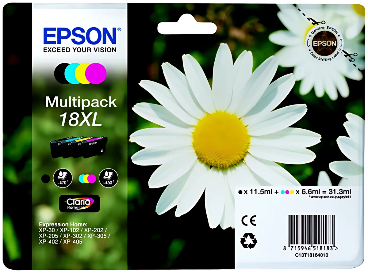 Epson C13T18164012/18XL Tintenpatrone MultiPack Bk,C,M,Y High-Capacity 470pg + 3x450pg, 1x 12ml + 3x 7ml VE=4 - Hohe Kapazität für gestochen scharfe Ausdrucke.