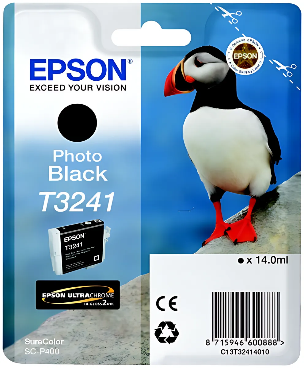 Die Herstellernummer Epson T3241 / C13T32414010 bezeichnet ein Verbrauchsmaterial des Typs Tintenpatrone, das in bestimmte Drucker passt, darunter z. B. "Epson SureColor SC-P 400". Die Komponente hat die Farbe schwarz, eine erwartbare Reichweite von 4’200 Seiten und einen Inhalt von 14 ml.