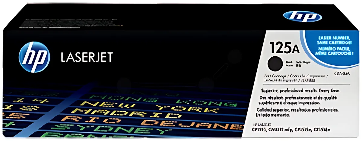 Die Bezeichnung "125A" steht für die Tonerserie, während "CB540A" die spezifische Produktnummer für die schwarze Variante darstellt. Diese Kartusche ist Teil eines umfassenden Farbtonersystems, das auch HP 125A / CB541A Toner cyan, HP 125A / CB542A Toner gelb und HP 125A / CB543A Toner magenta umfasst.