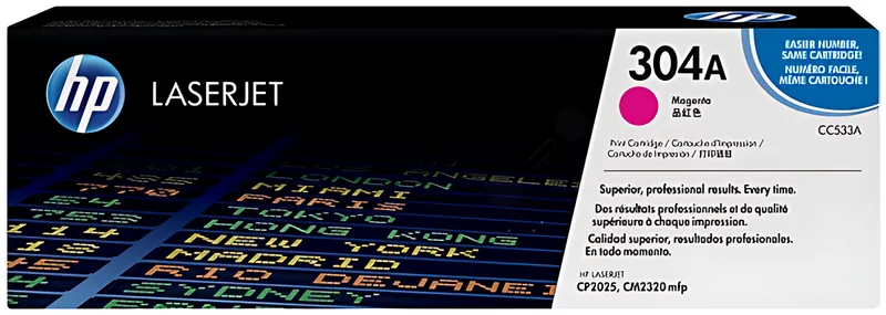 Die HP 304A Toner-Serie umfasst verschiedene Varianten mit den Modellnummern CC530A (schwarz), CC531A (cyan), CC532A (gelb) und CC533A (magenta) sowie praktische Mehrfachpakete für kosteneffizientes Drucken.