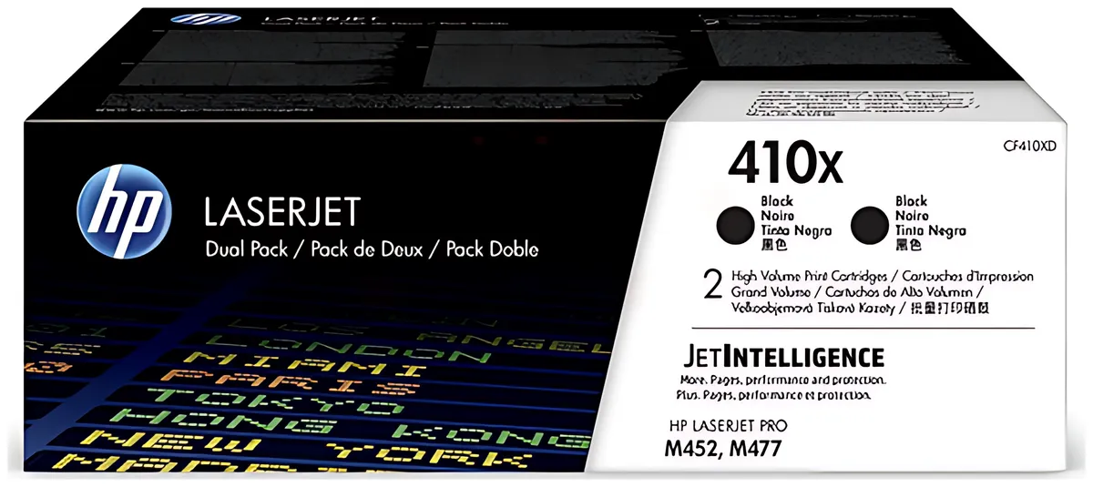 Der HP 410X / CF410XD (Modellnummer CF410XD) ist ein originaler Toner von Hewlett-Packard, der zur 410X High-Capacity Serie gehört. Als Doppelpack liefert er insgesamt 13.000 Seiten Druckkapazität bei 5% Deckung gemäss dem international anerkannten ISO/IEC 19798 Standard.