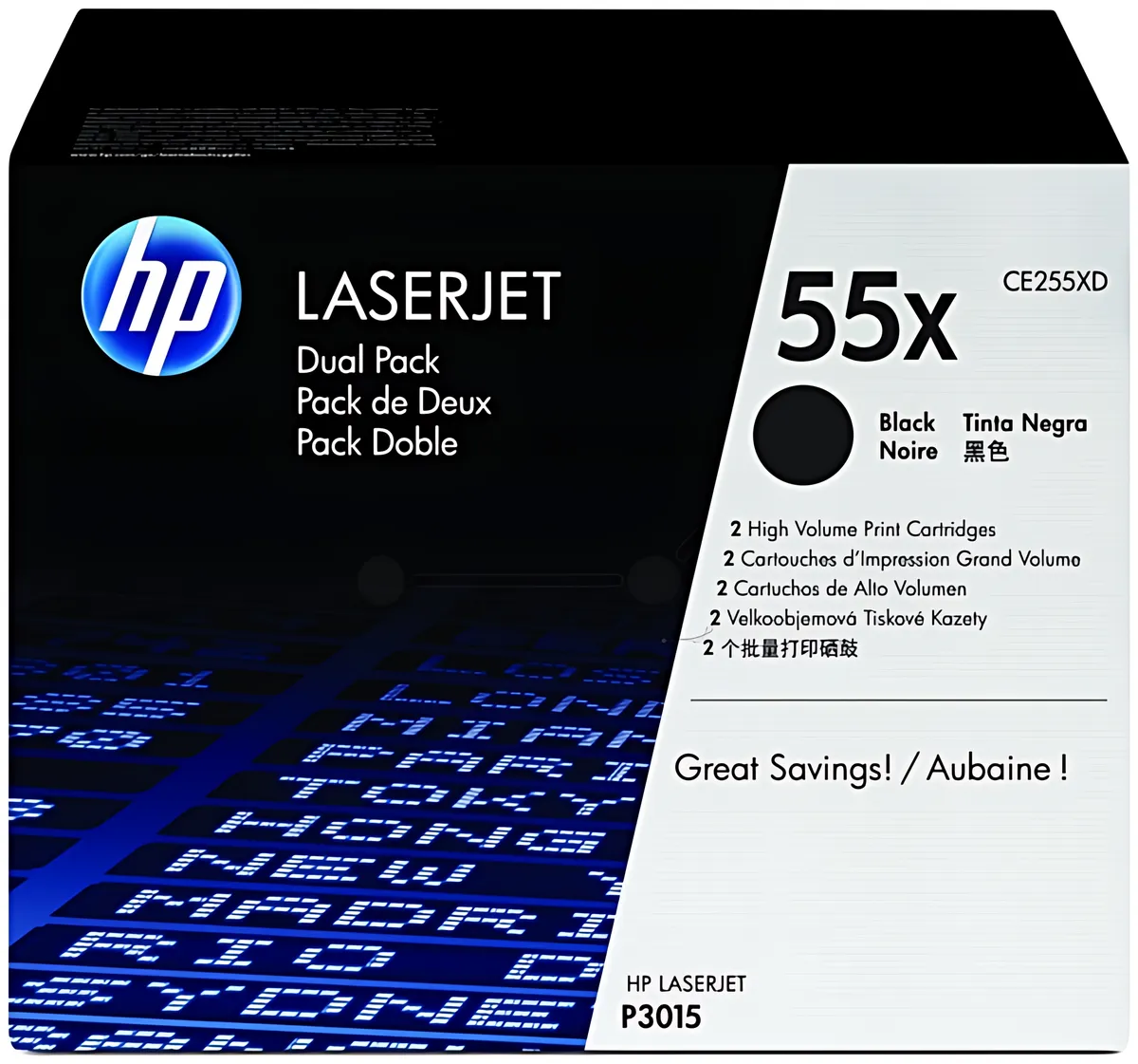 Der HP 55X / CE255XD Toner schwarz ist die High-Capacity-Version der HP 55A-Serie und bietet als Doppelpack eine besonders wirtschaftliche Lösung für Vieldrucker. Die Bezeichnung CE255XD steht für die Modellnummer, wobei das "X" für High-Capacity und das "D" für Dual-Pack steht.