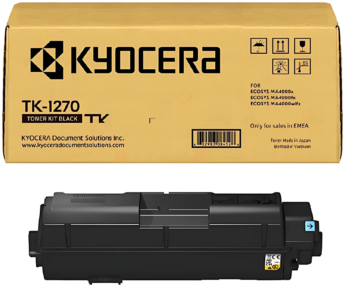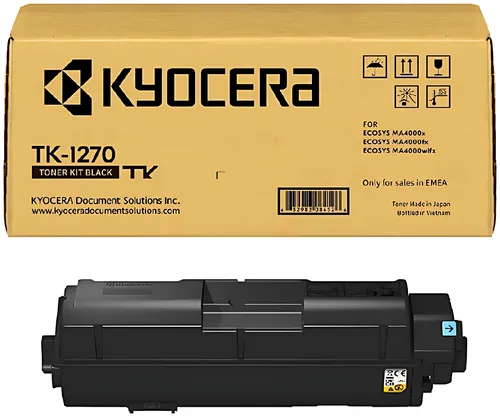 Die Herstellernummer Kyocera TK-1270 / 1T0C140NL0 bezeichnet ein Verbrauchsmaterial des Typs Toner, das in bestimmte Drucker passt, darunter z. B. "Kyocera ECOSYS MA 4000 fx", "Kyocera ECOSYS MA 4000 wifx" und "Kyocera ECOSYS MA 4000 x". Die Komponente hat die Farbe schwarz und eine erwartbare Reichweite von 10’000 Seiten.