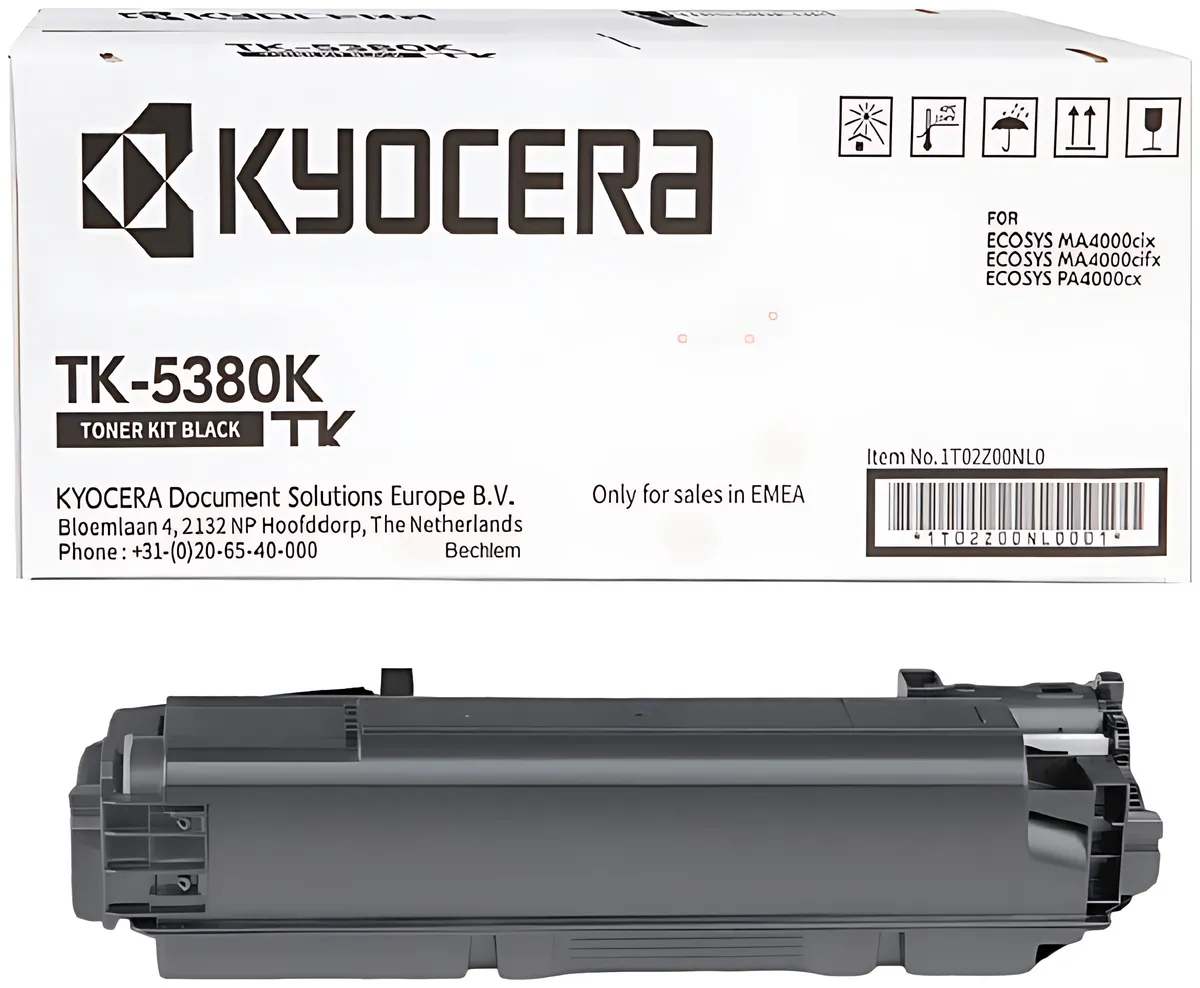 Die Herstellernummer Kyocera TK-5380K / 1T02Z00NL0 bezeichnet ein Verbrauchsmaterial des Typs Toner, das in bestimmte Drucker passt, darunter z. B. "Kyocera ECOSYS MA 4000 cifx", "Kyocera ECOSYS MA 4000 cix" und "Kyocera ECOSYS PA 4000 cx". Die Komponente hat die Farbe schwarz und eine erwartbare Reichweite von 13’000 Seiten.