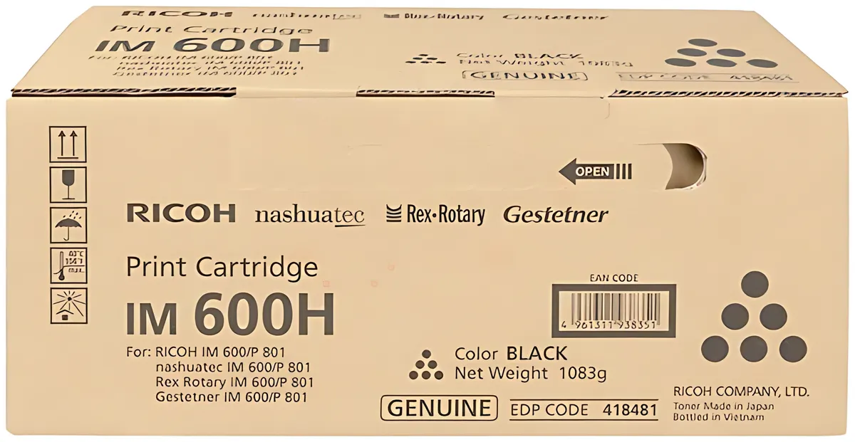 Der hochwertige Toner IM600H / 418481, schwarz, 40’000 sorgt für gestochen scharfe Ausdrucke mit langer Haltbarkeit. Perfekt für professionelle Dokumente und brillante Grafiken.
