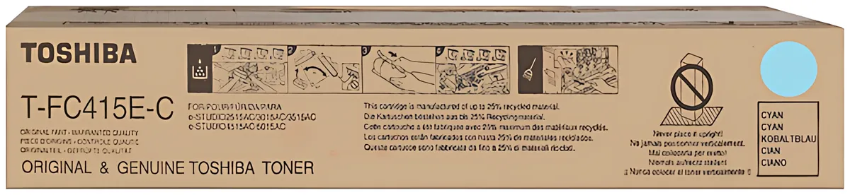 Die Herstellernummer Toshiba T-FC415EC / 6AJ00000172 bezeichnet ein Verbrauchsmaterial des Typs Toner, das in bestimmte Drucker passt, darunter z. B. "Toshiba E-Studio 2515 AC", "Toshiba E-Studio 3015 AC" und "Toshiba E-Studio 3515 AC". Die Komponente hat die Farbe cyan und eine erwartbare Reichweite von 33’600 Seiten.